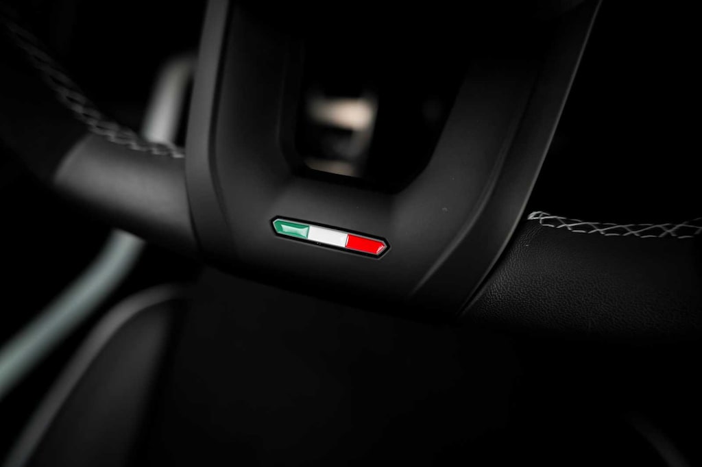 Bianco Monocerus exterior over Nero Cosmus interior. Carbon fiber accents, Alcantara surfaces, advanced driver displays, premium audio, and performance-focused cockpit design throughout.